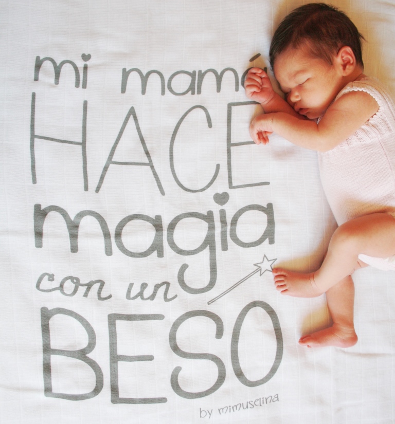 - Muselina de Mimuselina, con frases originales estampadas con tinta inócua para tu bebé. Son extra grandes, de 1x1m y de algodón 100% que utilizaréis muchísimo. Mi peque no se dormía sin ellas. Las tenía yo cerca del pecho, olían a mí, y dejándoselas en la cuna se agarraba a ellas y no se dormía sin tenerla. También la utilizarás si durante la noche le das el pecho y echa un poquito o se sale algo de leche. Ten una siempre a mano, además en la chichonera con bolsillo podrás guardarla y localizarla rápido también. ¡Cómo me emociona ver a Valeria tan pequeñita en su muselina!