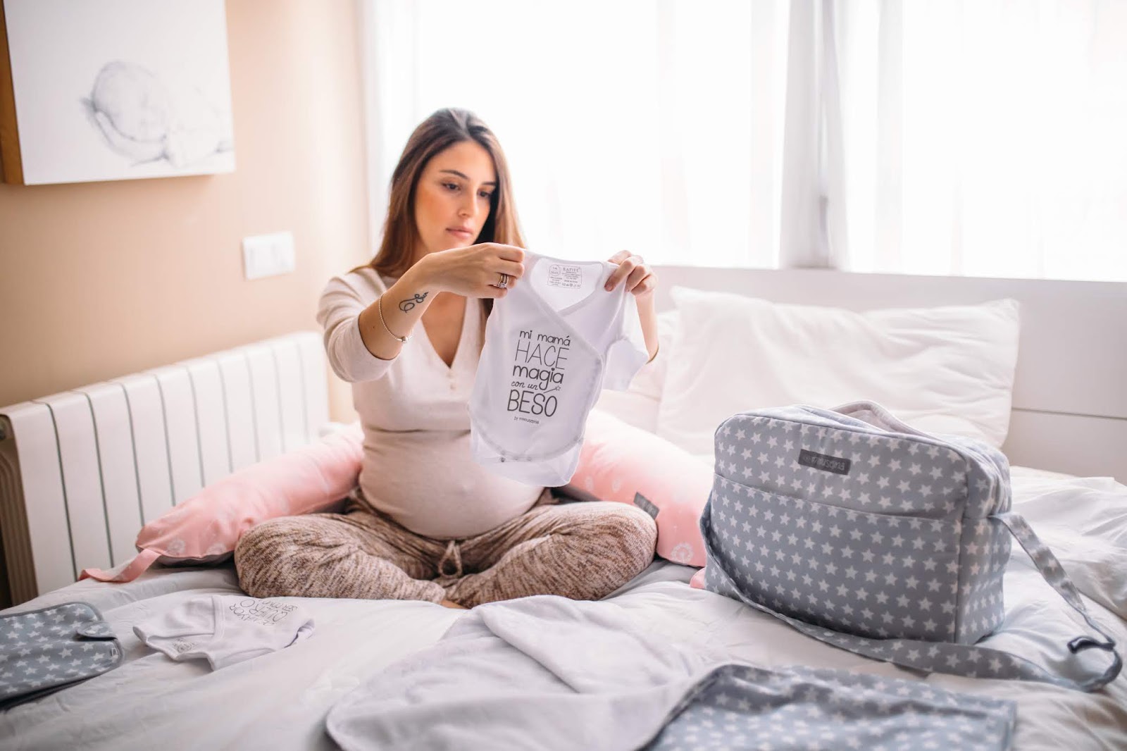 Cojín, bolsa maternal, arrullo y body de Mimuselina |