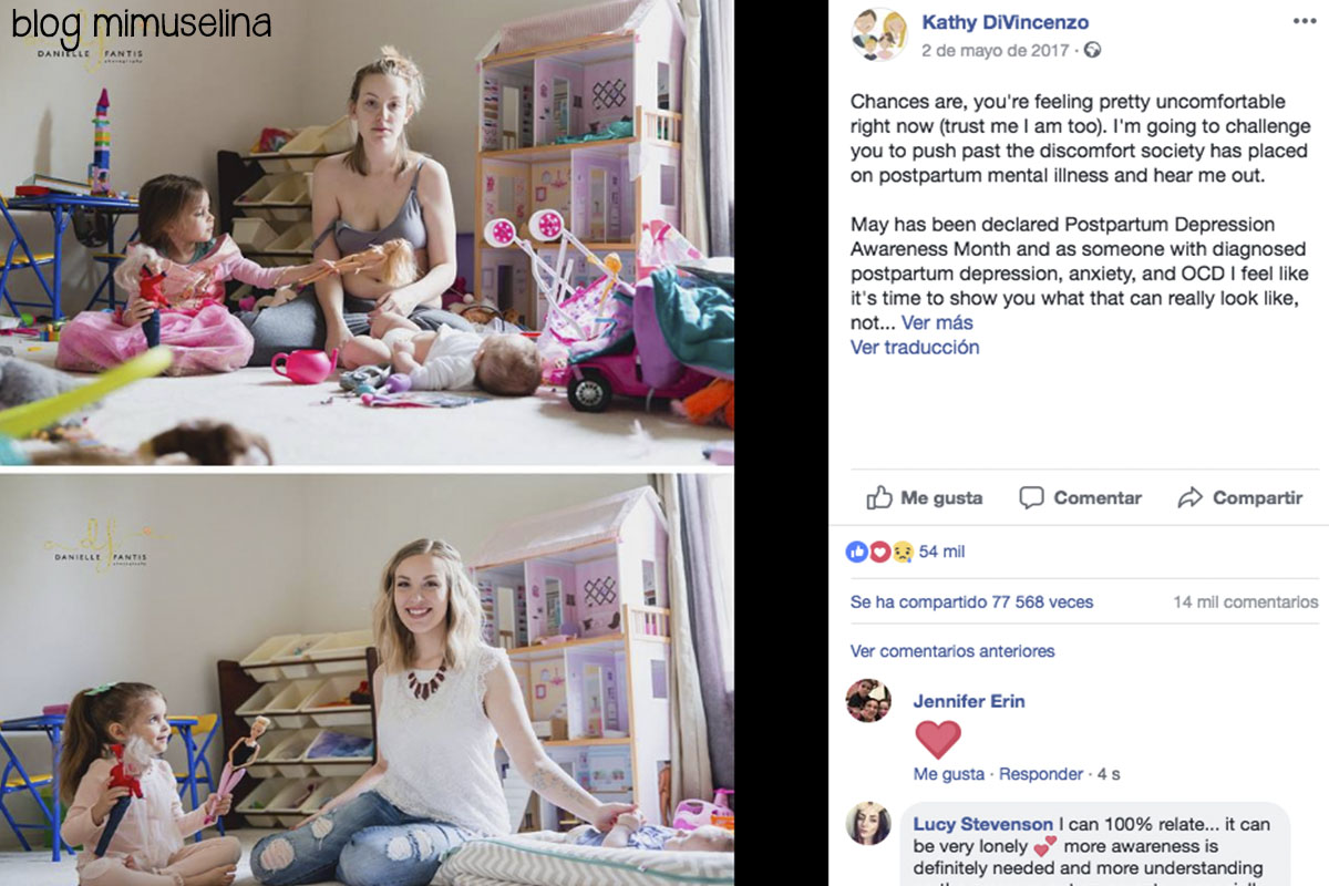 Y como os comentaba hace un momento, lo de tener la casa perfecta, os podéis olvidar. Es broma, jeje. Aunque lo puede resultar gracioso a Kathy DiVicenzo le costó una depresión postparto. Cuando asumió su realidad decidió compartirla con todo el mundo. Es madre de dos niños y sufre ansiedad, trastorno obsesivo compulsivo y depresión postparto. Muchos se plantean cómo en el momento en teoría más feliz de tu vida puedes no sentir nada o estar muy triste. Kathy pasó por ello viendo la vida "ideal de la muerte" que se veía en Facebook o Instagram. Esas imágenes no representaban su realidad y ella decidió enseñarla. El antes y el después, así denunciaba cómo se construyen realidades que pueden afectar y dañar a la fortaleza de una mujer que acaba de dar a luz y que se ve superada por muchas cosas. Esto también es #maternidadreal.