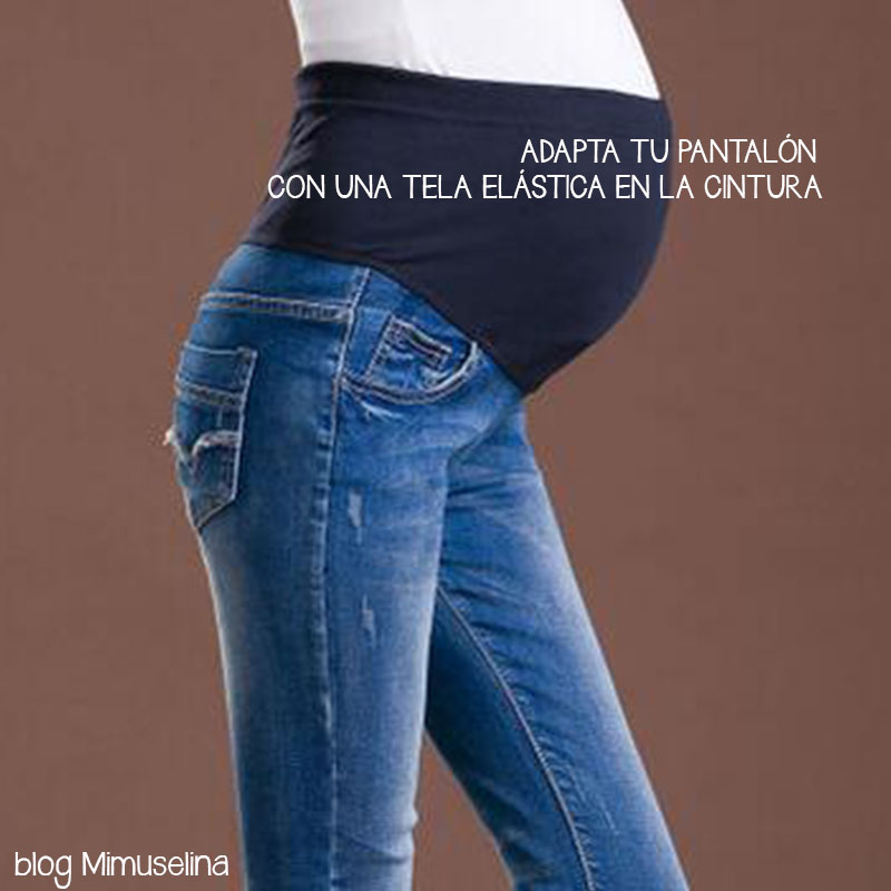 Puedes coger un trozo de tela elástico o de otro estampado y adaptársela a leggins o pantalones que tengas, así podrán aguantarte más meses en la evolución de tu embarazo.
