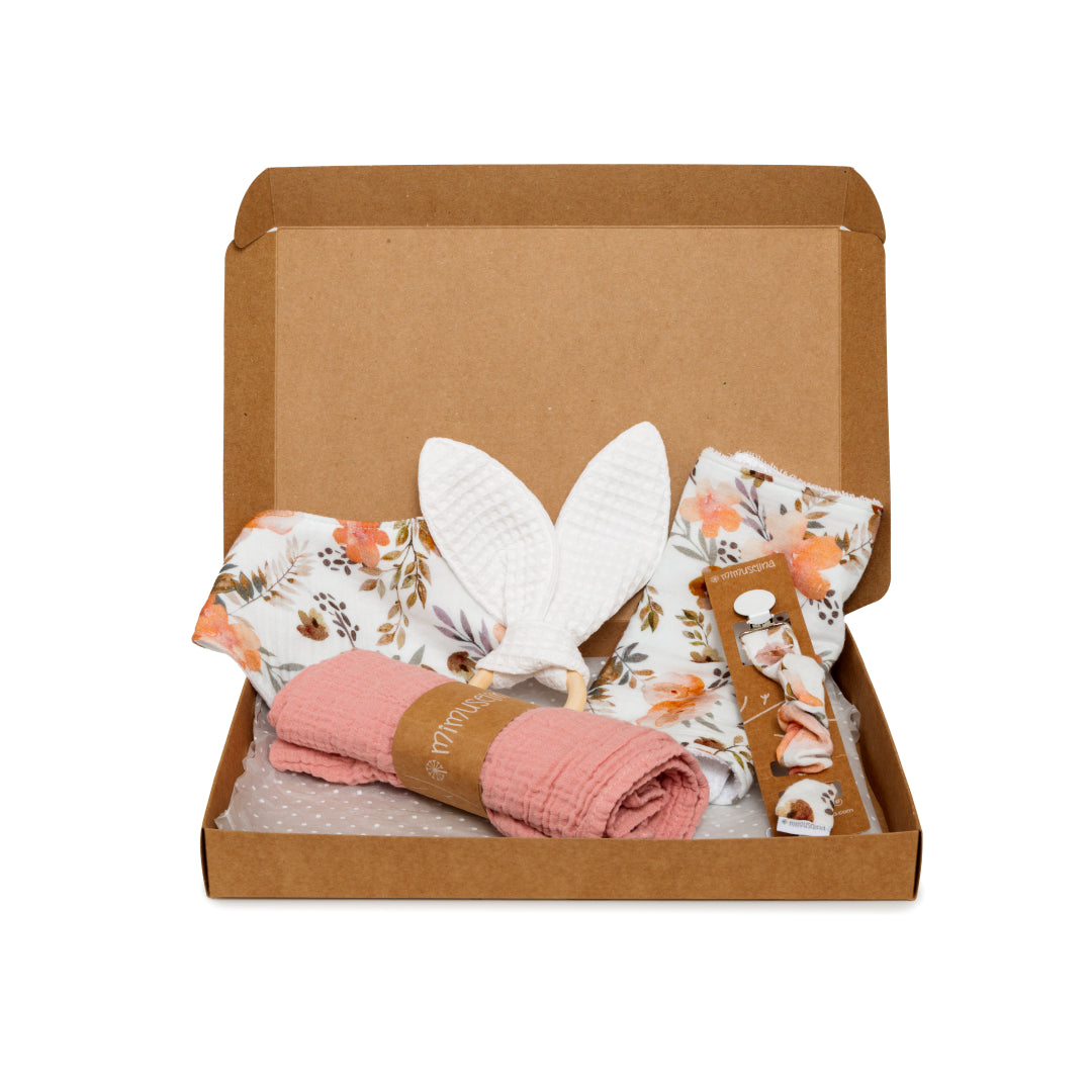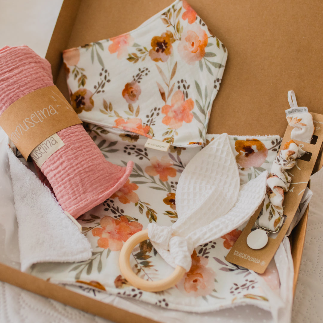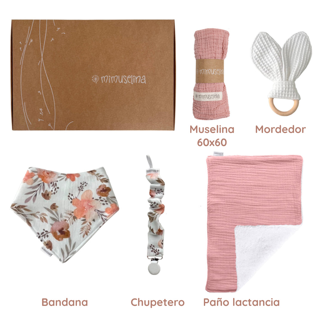 Adornado en rosa y con un encantador estampado floral sobre fondo blanco, este pack regalo incluye elementos indispensables como un chupetero de tela, un paño para lactancia y una muselina ultra suave, además de accesorios necesarios para la dentición y la alimentación.