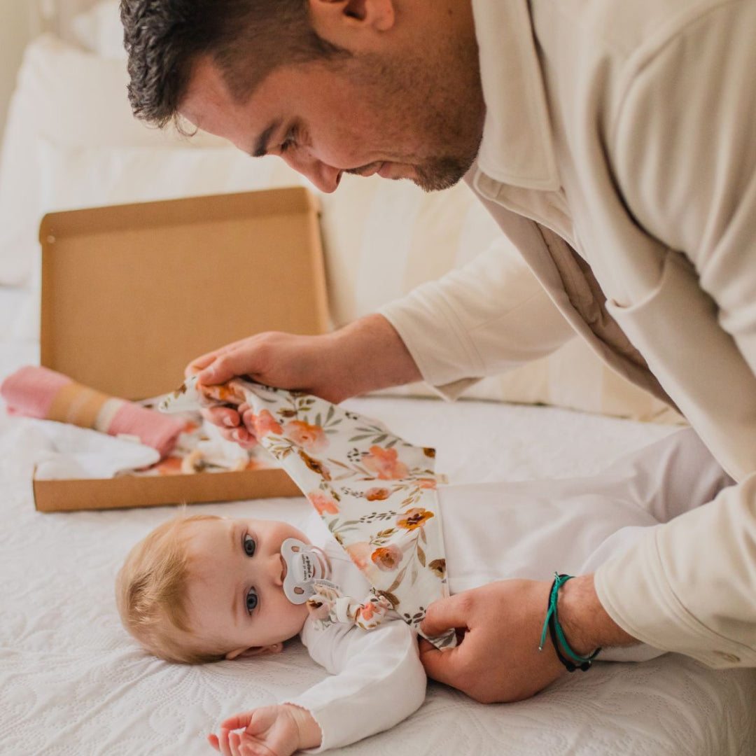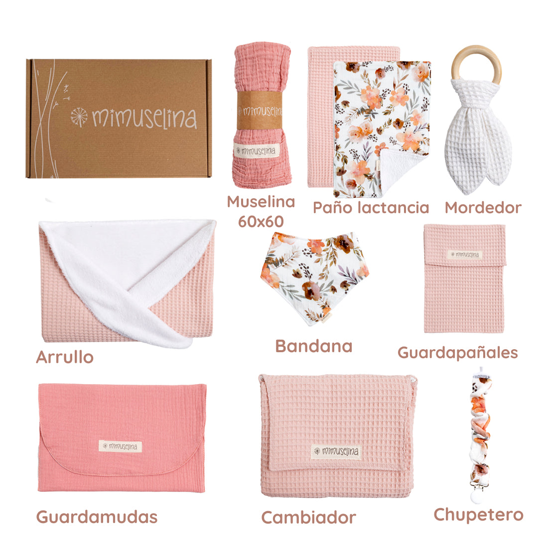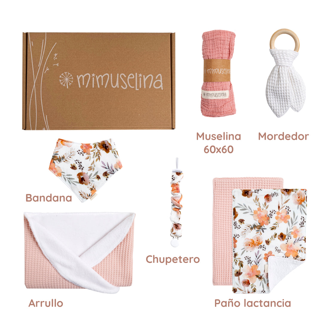 Adornado en rosa y con un encantador estampado floral sobre fondo blanco, este pack regalo incluye elementos indispensables como un chupetero de tela, un paño para lactancia y una muselina ultra suave, además de accesorios necesarios para la dentición y la alimentación.