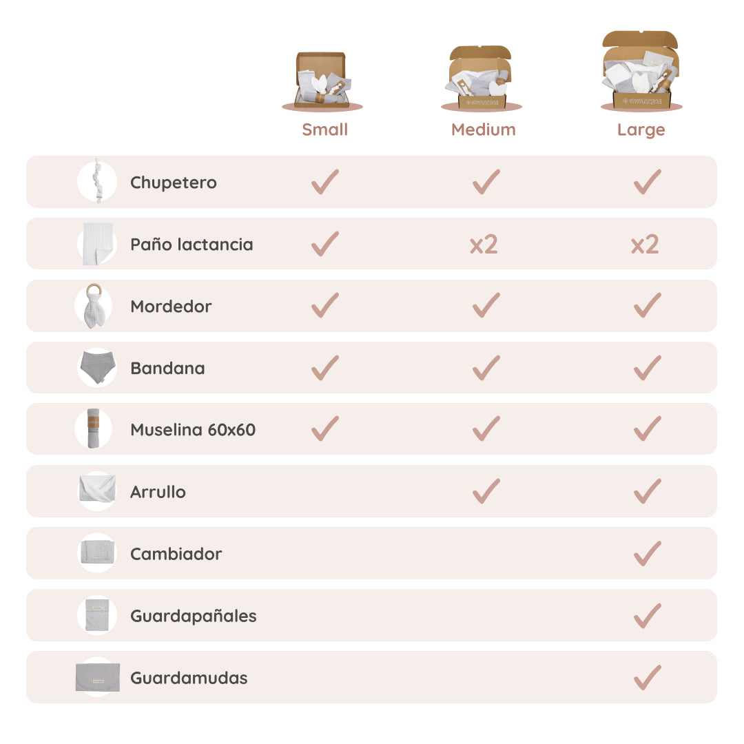 Large (20x30x9.8cm): La versión más completa, con todos los artículos de Medium más extras como los guardapañales y guardamudas, ideal para regalos especiales.