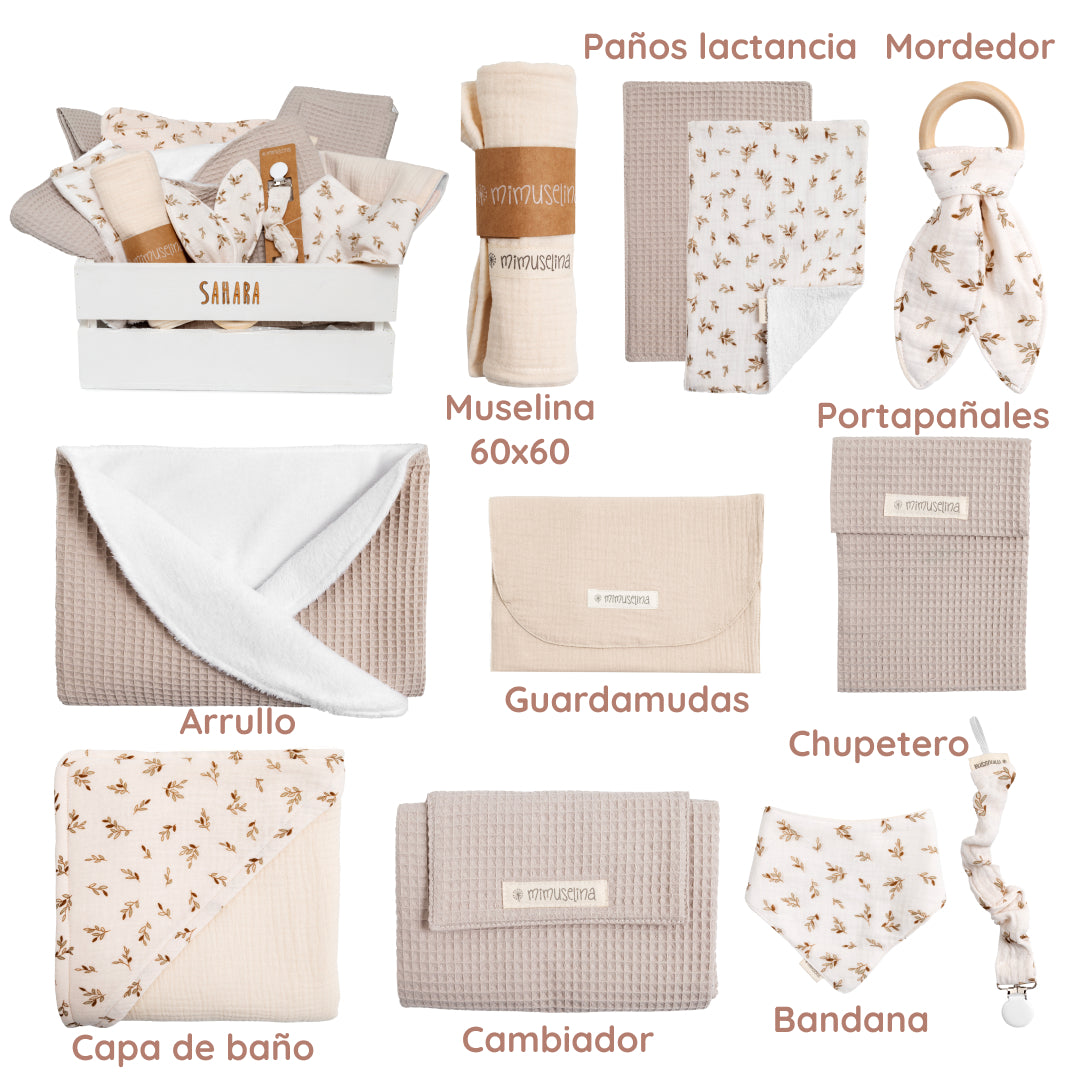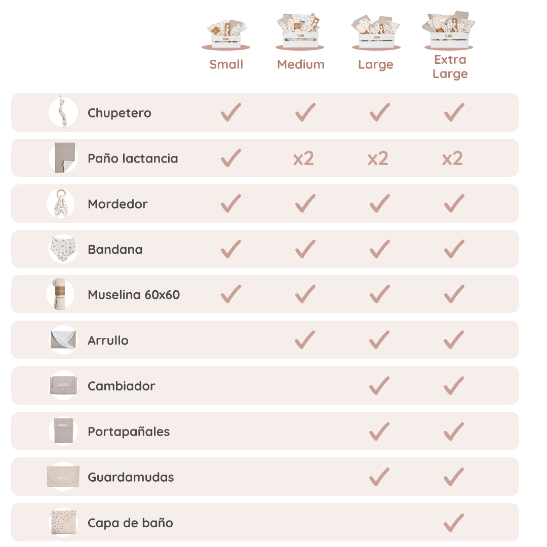 Extra Large (15x25x35 cm): La versión más completa, con todos los artículos de Large más extras como la capa de baño y guardamudas, ideal para regalos especiales.