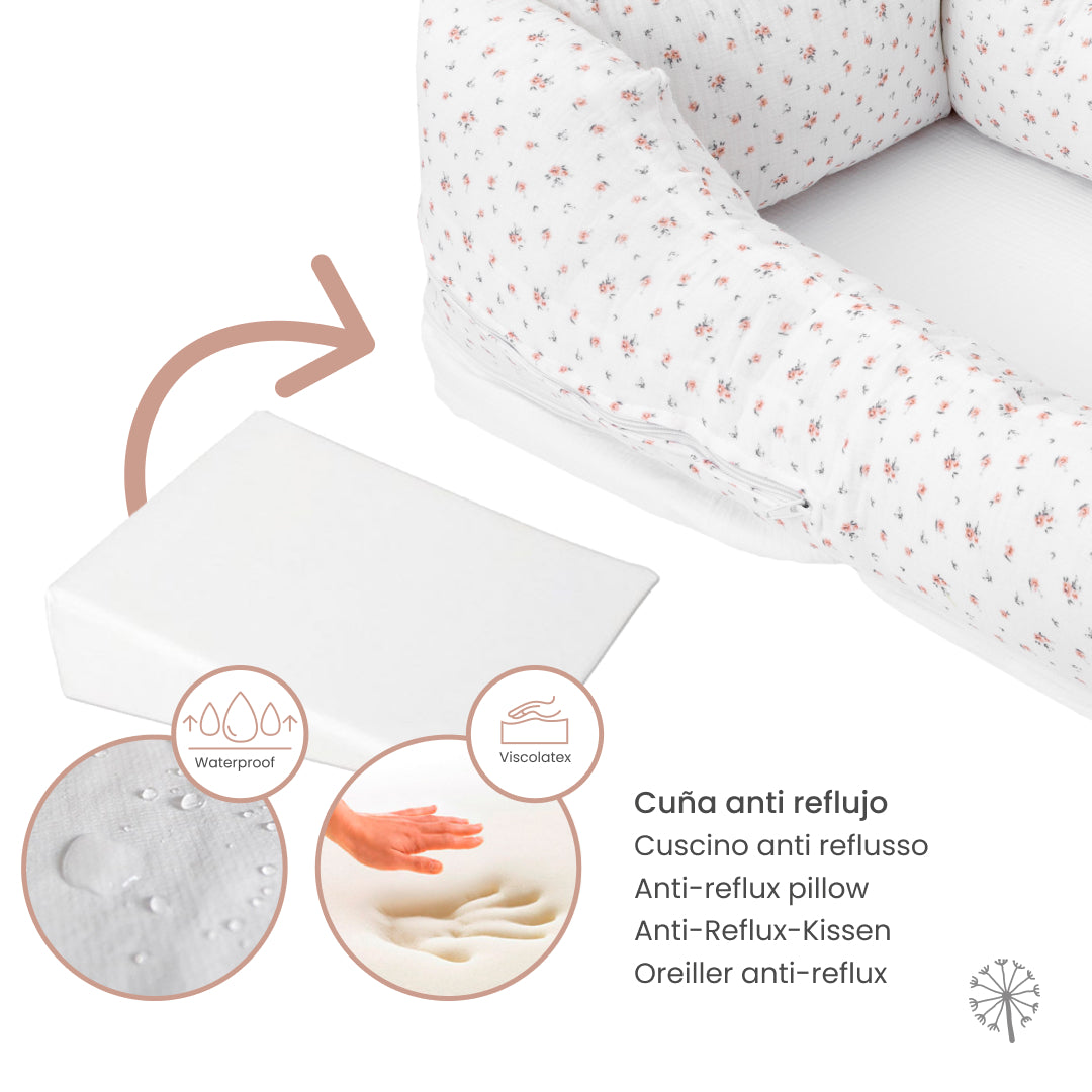 El cuco nido bebé de Mimuselina es el primero del mercado, patentado, en incluir la cuña elevadora que va genial para cuando los peques tienen reflujo, tos o moquetes. Esa inclinación permite liberar las vías respiratorias y favorece el descanso.