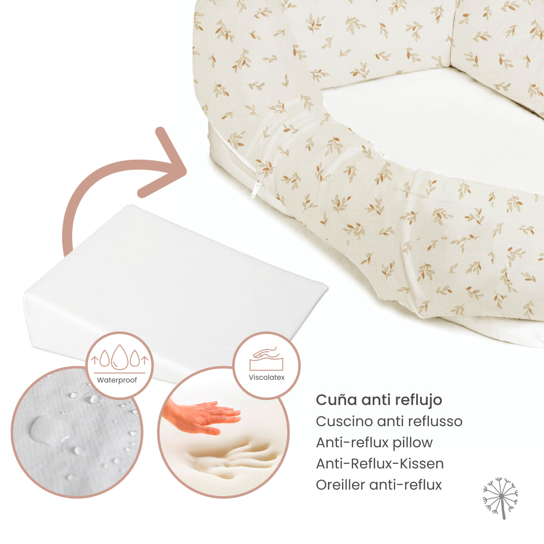 El nido bebé es desenfundable para poder lavarlo. Tiene tres cremalleras para separar y unir cada una de las partes. La base y la cuña están forradas de un tejido impermeable y anti-calado para que los posibles vómitos o escapes no traspasen y dejen el olor en los colchones. El relleno del churro es de fibra y la base podéis elegir entre gomaespuma o viscolatex que ayuda a prevenir la plagiocefalia.